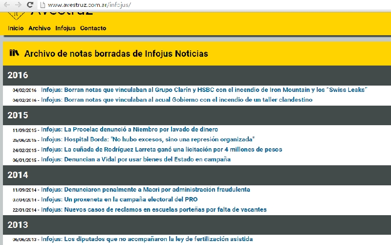 Entre los archivos que ya no se encuentran en el portal, figuran también notas que hablaban del incendio de Iron Mountain vinculando al Grupo Clarín y al HSBC; los talleres clandestinos de la Ciudad de Buenos Aires; la denuncia de la Procelac contra Fernando Niembro; una denuncia contra María Eugenia Vidal por utlización de bienes públicos en la campaña y otra que mencionaba la licitación que ganó la cuñada de Rodríguez Larreta en el Gobierno porteño. También faltan las que publicaban la nómina de legisladores que se opusieron a la ley de fertilización asistida; la que mencionaba los reclamos de los porteños por la falta de vacantes en las escuelas y la que denunciaba a Macri por "administración fraudulenta".