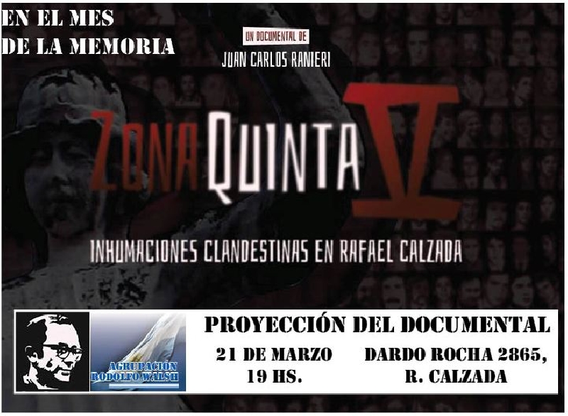 El Centro Cultural El Surco y la Agrupación Rodolfo Walsh fue el lugar elegido para la proyección del documental Zona Quinta, un film sobre los desaparecidos de Almirante Brown y las inhumaciones clandestinas que se realizaron en el cementerio municipal de Rafael Calzada durante la última dictadura cívico militar.