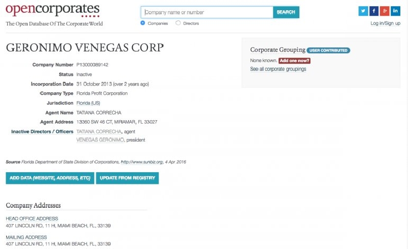 Así se desprende de Open Corporates, una de las bases de datos de compañías más grandes del mundo. Según la fuente, la empresa fue fundada hace dos años y figura bajo el nombre de Gerónimo Venegas Corp.
